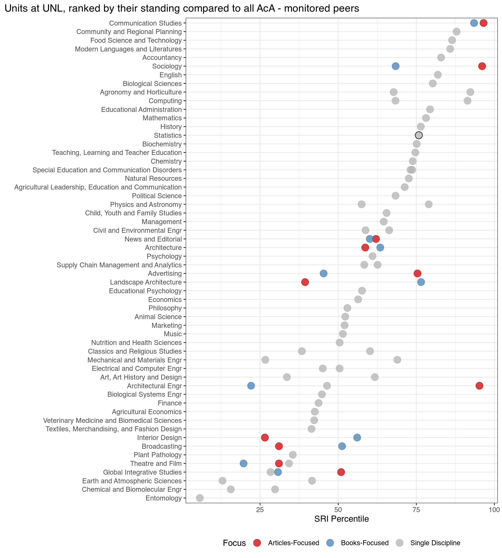 The UNL research z-score is created by standardizing each input measure with respect to all departments on campus before computing an unweighted average of each component z-score to form a single research index for each department. This is fundamentally problematic, as the SRI measure used by academic analytics not only incorporates many of the components used (federal expenditures, awards, books, citations), but also because the discipline-specific weightings are intended to allow for comparison within-disciplines, and they are being used here as a cross-discipline comparison. That is, the z-score method indicates a fundamental misunderstanding of both the Academic Analytics (and AAU) metrics and the appropriate use of statistical methods. It would be quite reasonable to use the SRI percentile for each department, which compares the department’s research reputation relative to other departments in the same area, compute a normal quantile from the percentile, and then use that z-score to represent the department’s research reputation. This would also allow for use when averaging z-scores from other research metrics to produce a single research summary; which is a practice that is reductive and not particularly effective, but is also not definitively wrong.