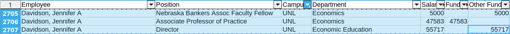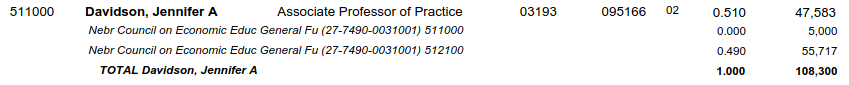 The salary spreadsheets appear to show the cost distribution for a position (e.g. where the money comes from), but only when the position is more complicated than just having funding from multiple departments indicating a partial appointment, as shown in Figure C.1. This happens most frequently when someone has administrative responsibilities in addition to standard research or teaching responsibilities.
