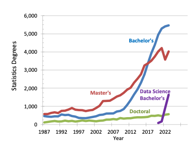 The number of U.S. undergraduates earning degrees in statistics has increased more than six-fold since 2010, with over 5,500 bachelors degrees awarded in 2023, with the number of institutions offering such programs nearly doubling over the same period (from 95 to 184). At the Master’s level, statistics degrees have increased 150% since 2010 to 5,150 in 2023, while data science and analytics-related degrees increased an astonishing 15-fold to more than 12,000 in that period. The number of universities granting statistics and data-intensive degrees also grew from 70 to 300. These trends reflect the central role of statistics and data science in today’s workforce; the financial benefit to UNL, Nebraska, and the overall U.S. economy cannot be overstated. – Brad Carlin, UNL Math & Statistics alumni, former faculty at CMU and University of Minnesota Statistics, President of Biostatistical Consulting