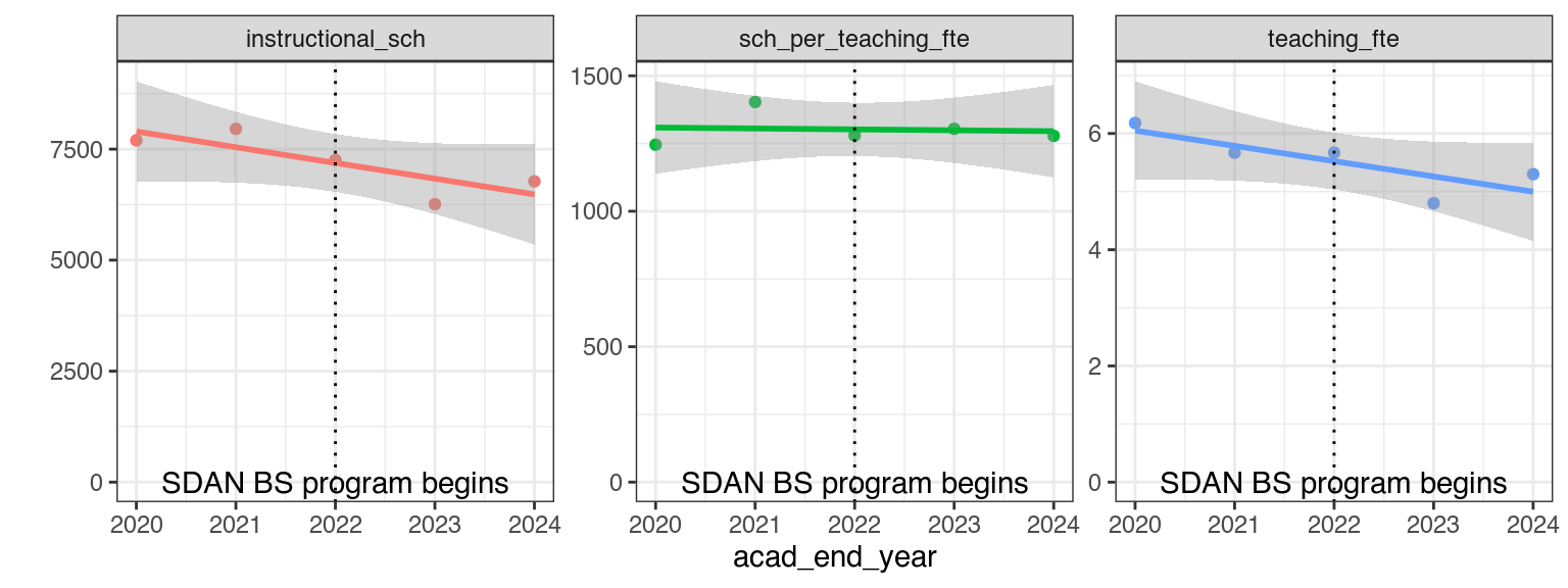 Figure Figure 6.2 shows that the instructional productivity of the statistics department has not effectively changed (panel 2) over the 2020-2024 period. We suspect that this quantity is likely to actually increase if numbers from 2024-25 and 2025-26 were included, as our programs are maturing and we have taken steps to increase class size and instructional efficiency since our new chair was hired in Summer 2024. None of these changes are reflected in the assembled metrics.