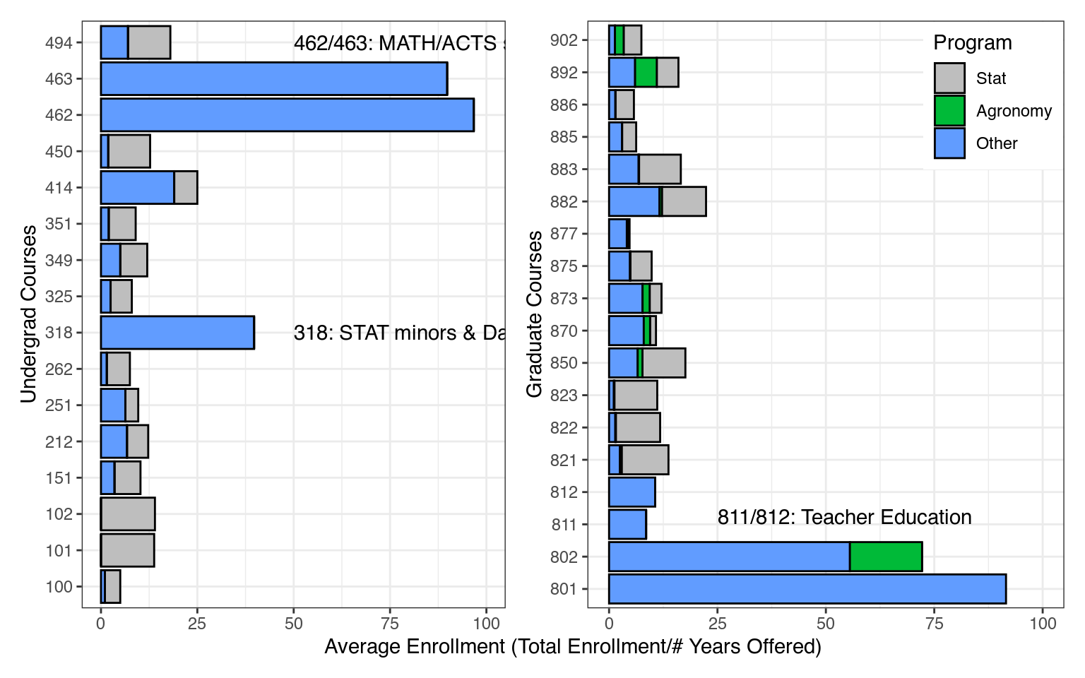 In addition to the listed courses, many graduate statistics courses are taken as electives (or graduate committee-level requirements) to ensure that students have appropriate quantitative training for their research topics and fields. Courses like Stat 850 – Computing Tools for Statistics – teach R and python “data wrangling” skills, data visualization, reproducible research, and statistical simulation. The undergraduate computing sequence, Stat 151, 251, and 351, are similarly useful across multiple disciplines, though these courses were developed for the statistics undergraduate program. Relatively quickly after the courses were created, the Digital Agriculture minor was created with the requirement that students take Stat 151 and 251. Similarly, we believe that Stat 349, Technical Skills for Statisticians, might be useful to students in Computer Science who need a technical writing course, though this potential was only identified recently, and we would need to get ACE 2 certification for the course.